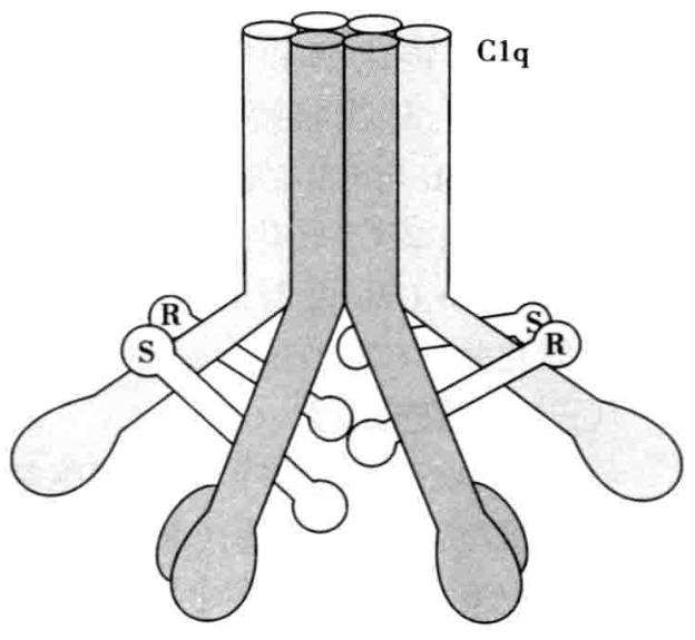大部分补体成分以符号“C”表示,按其发现顺序命名为C1、C2、C3……C9。C1有C1q、C1r、C1s三种亚单位(图4-1)。其他成分用B因子、D因子、P因子、H因子、I因子等表示。补体调节蛋白多以功能命名,如C1抑制物、C4结合蛋白、促衰变因子等。