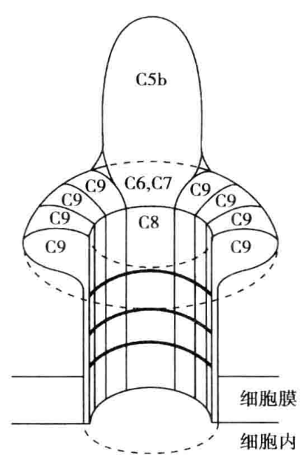 C5转化酶裂解C5,形成C5a和CSb;CSh结合于靶细胞膜,依次结合C6、C7、C8和多个C9分子,形成C5h6789n,即膜攻击复合物(MAC)