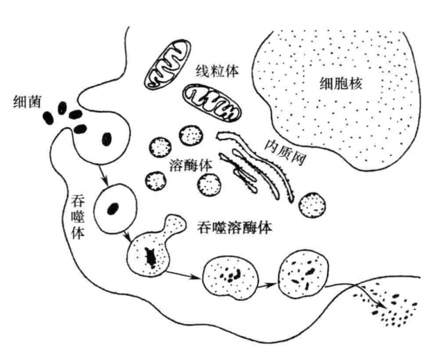 (1)吞噬细胞的吞噬杀菌过程:吞噬和杀菌过程一般分为三个阶段: 1. 吞噬细胞与病原菌接触:这种接触可以是偶然相遇,也可通过趋化因子作用,使吞噬细胞向感染部位作定向移动; 2. 吞入病原菌:有两种方式,一是吞噬作用,由吞噬细胞伸出伪足将大分子物质包绕并摄入细胞质内,形成吞噬体;另一种是吞饮作用,由细胞膜内陷直接将小分子物质吞入细胞质中,形成吞噬小泡; 3. 消化病原菌:吞噬体形成后,胞浆中的溶酶体与之靠近接触,融合成为吞噬溶酶体,溶酶体中的各种水解酶如髓过氧化物酶等即可发挥杀灭、溶解及消化作用,并将不能消化的残渣排出吞噬细胞外。 (2)吞噬作用的结局: 4. 完全吞噬:多数细菌被吞噬后,可完全被杀灭、消化; 5. 不完全吞噬:某些细菌如胞内寄生菌被吞噬后,在缺乏特异性细胞免疫的机体内,细菌不但不被杀死,反而在吞噬细胞内生长繁殖并损伤破坏吞噬细胞,病原菌还可随游走的吞噬细胞经血液、淋巴液扩散到其他部位,造成广泛的病变; 6. 造成组织损伤:吞噬细胞在吞噬过程中,有时向胞外释放多种溶酶体酶,破坏邻近组织细胞,损伤组织,如损伤肾小球基底膜,引起肾小球肾炎等。